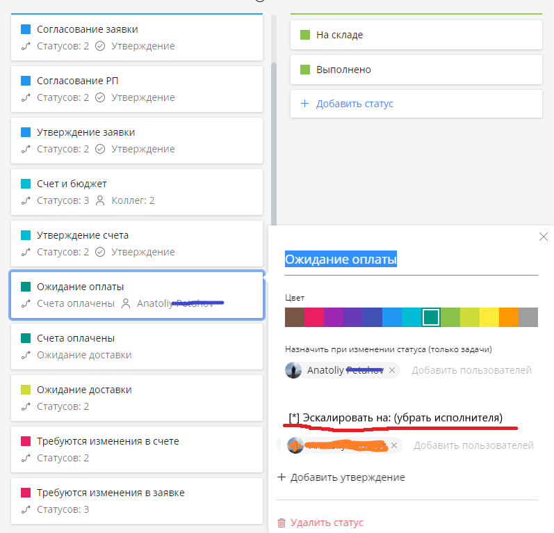 Руководители отделов согласовывают заявку, руководитель проекта утверждает заявку, следом попадает исполнителю в ОМТС, параллельно исполнителем является Фин.отдел (добавляет в бюджет), после утверждается счет, далее отрабатывает исполнитель от бухгалтерии, после оплаты статус переходит на ожидание доставки и снова на контроль исполнителю ОМТС. И к концу процесса у меня подвешены 4 исполнителя, а то и больше. И получается один отработал в начал, а следующий исполнитель тянет сроки по каким-либо причинам, из-за этого в отчете мы видим не актуальную информацию с просроченными сроками у исполнителя, хотя он отработал свою задачу. Необходимо внедрить функцию ЭСКАЛАЦИИ задачи другому исполнителю, не только для рабочего процесса, а в целом наподобие как утверждение (значок на панели, где можно видеть, кто на кого перевёл задачу, при наведении на значок или клик, банально отображение аватаров исполнителей со стрелочками).