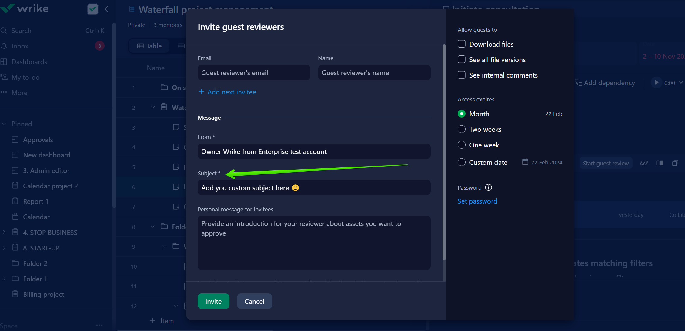 Would love to be able to customize the email subject line sent to the guest reviewer inviting them to review a video. Right now it says "Stacy Herbener invited you to review files in Wrike". The guest reviewers may not know who Stacy Herbener is and they definitely do not know what Wrike is. Further, if we invite them to review 8 different projects at once, it's impossible to differentiate the reviews based on the invites in email since the subject line is the same. A customized subject line, or at least some additional unique identifiers would help with this.