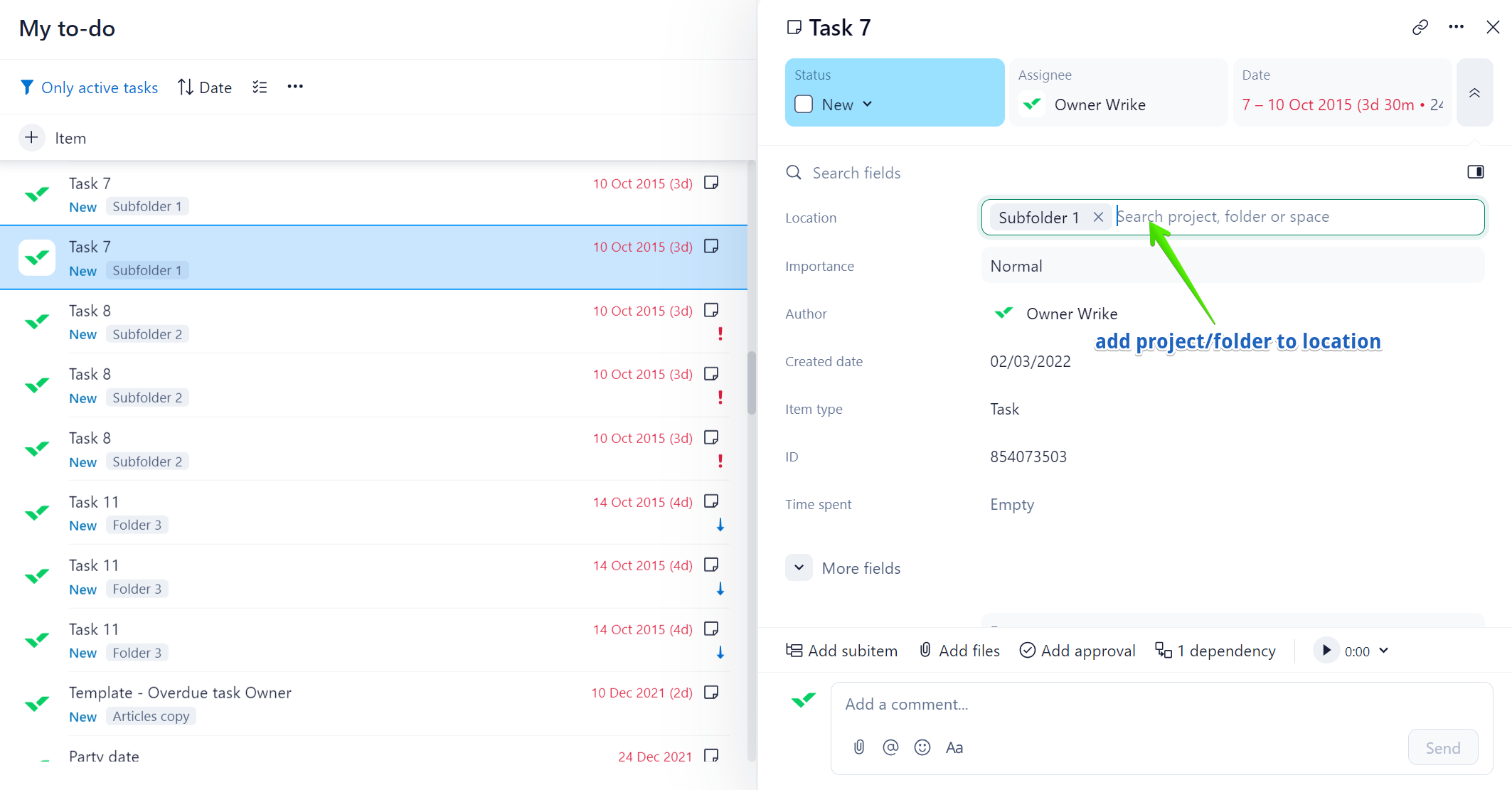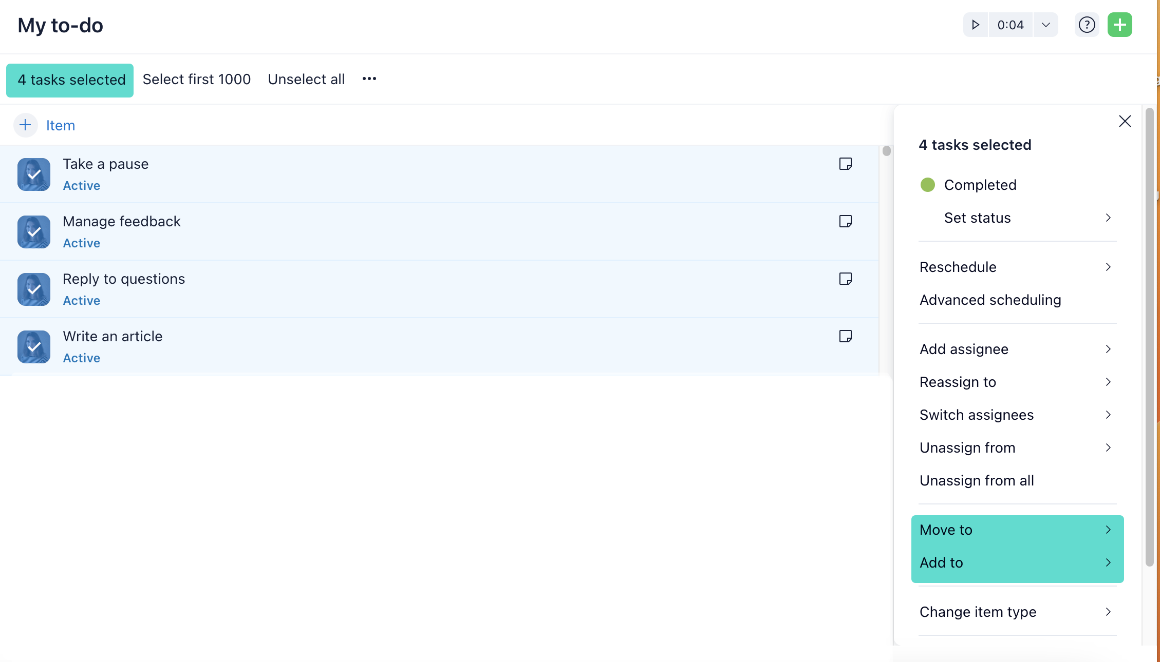 Hey Adam Mitchell, let me jump in for Juan here 👋 You can mass select and edit tasks in My to do. The option to "Move to" will change the current folder/project, and the "Add to" option will add a new project/folder to the task: