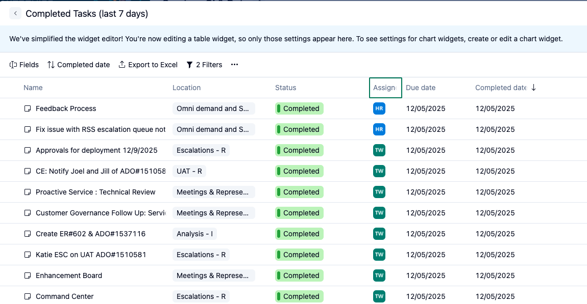 But we would like the Dashboard to indicate WHEN each task was completed and that doesn't currently seem possible. And the completed widgets show completed tasks in order by oldest first, which is the opposite of what we want.