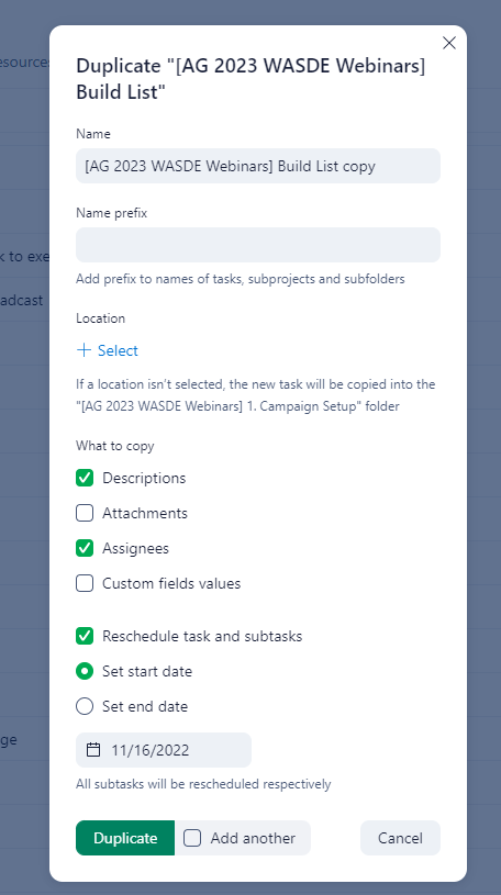 Very often I need to create a number of extra tasks that are identical to an existing one. These "duplicated" tasks need to include all the parameters of the original one and, most of times, only one parameter needs to be changed (eg: start and end date).