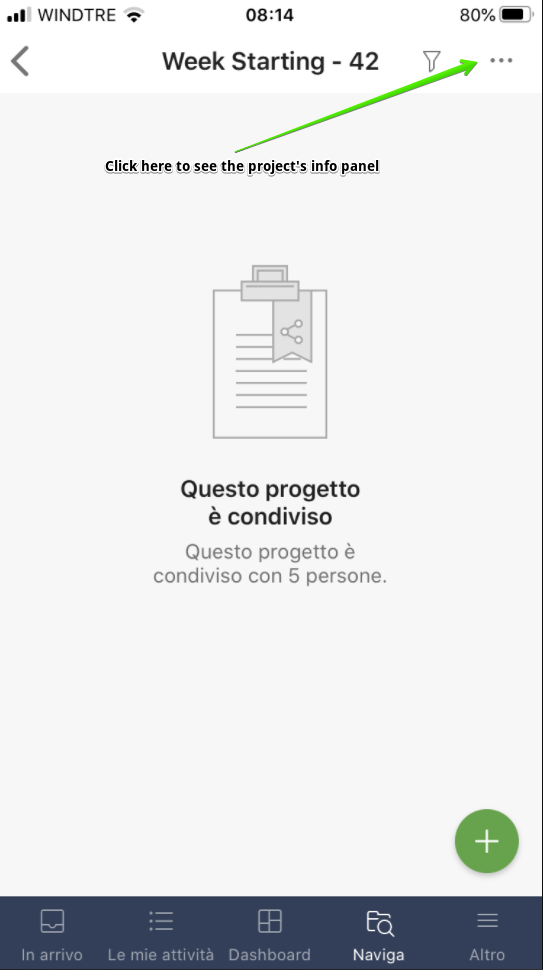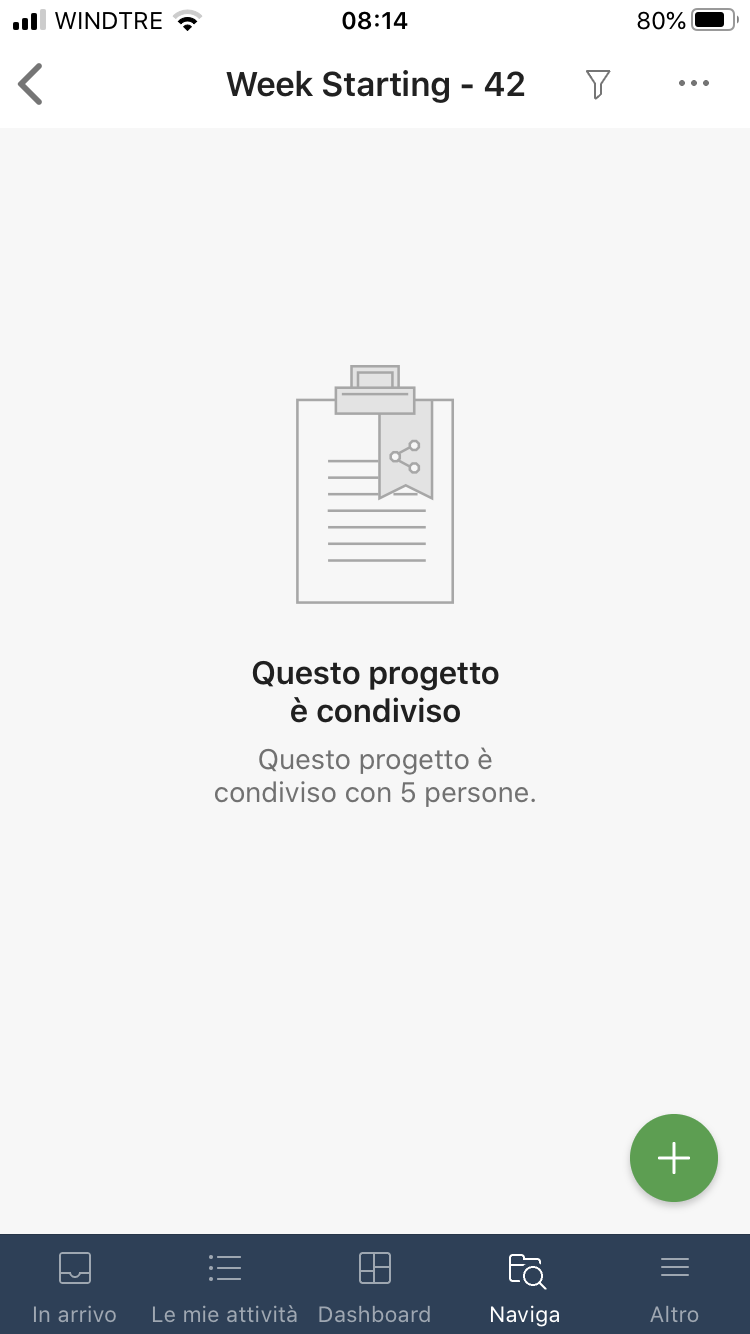 The view you are seeing in your iOS app for your project "Week Starting - 42" is the expected view when a project does not contain any tasks. You can still open the project's information panel by clicking the three-dots in the upper right corner: