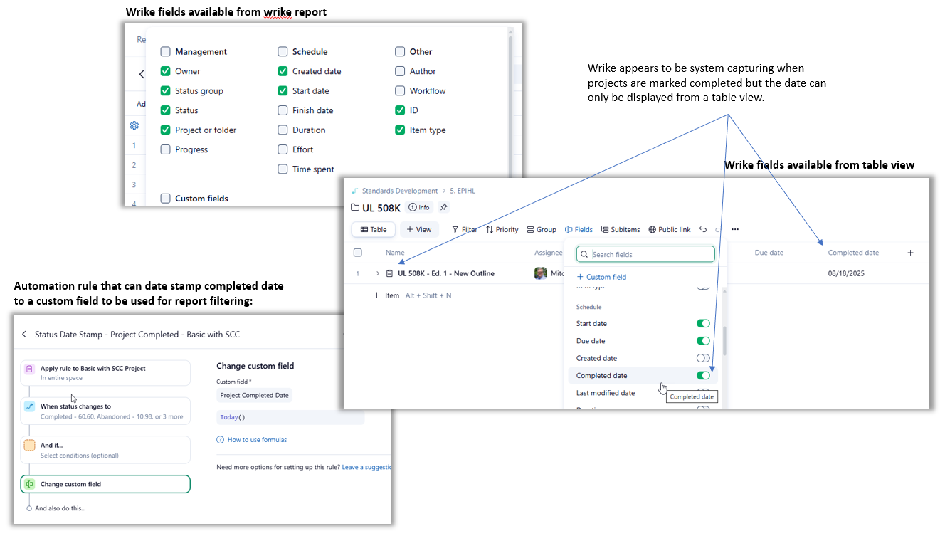 Wrike's latest 'change custom field' automation capability can likely help with this to stamp today's date when a specific status is set. See attached However, for legacy data before creating a rule, it appears Wrike is system capturing 'Complete date' for projects, it just cannot be surfaced from a report, only table view?