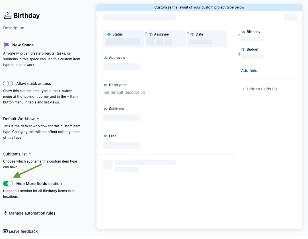 I agree with Stephen and Bernadette. A custom item type should not have any fields in it that have not been expressly added during the creation of the custom item type. We have projects in which we have around a dozen fields we want to be visible at all times. And then another dozen fields that we want to have in the "More Fields" section because they are helpful to be able to view within a project for reference when needed, but clutter up the project detail view when not needed. Having 3 separate locations for fields (Top Section that's always on, More Fields section that is collapsed by default, and Hidden Fields section which never show up in the project view, but only as a place to view unused fields during custom item creation.) Also, being able to drag fields from one location to the other when creating a custom view would also be helpful.