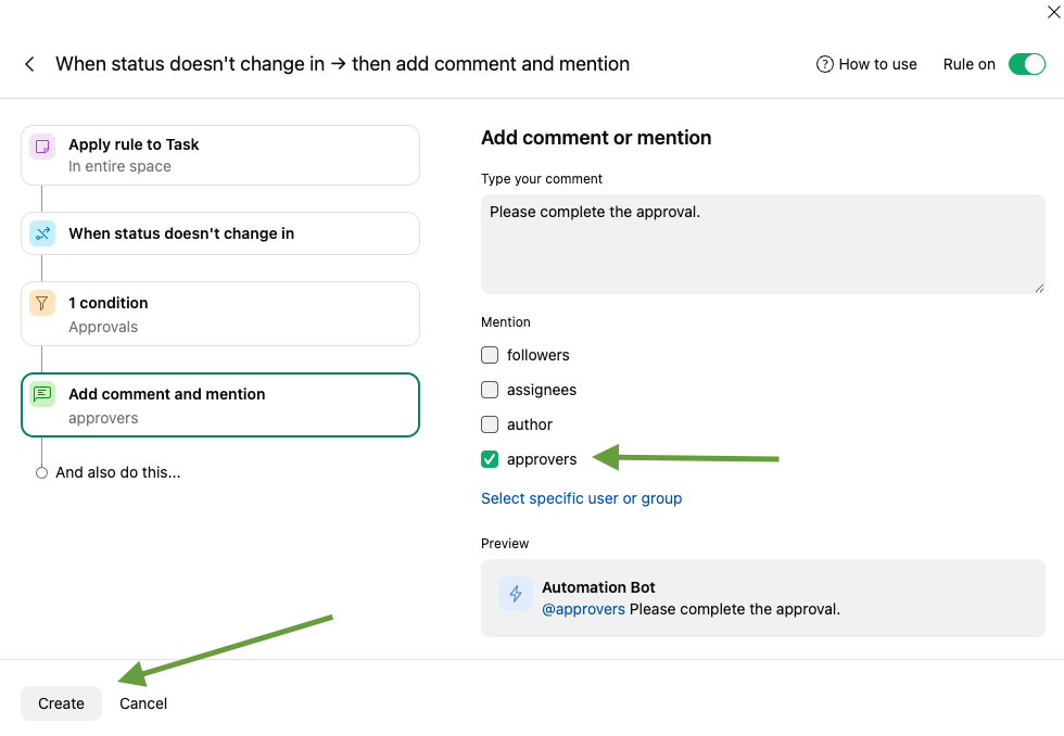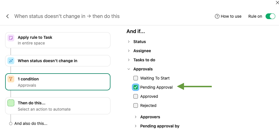 Hi all! Although it's not currently possible to add reminders to My to-do, it is possible to automatically ping approvers by creating an automation rule. You can select a trigger called 'status doesn't change in X amount of days', and add a condition to filter the tasks that are pending review. After that, select an action to send a reminder to the approvers: