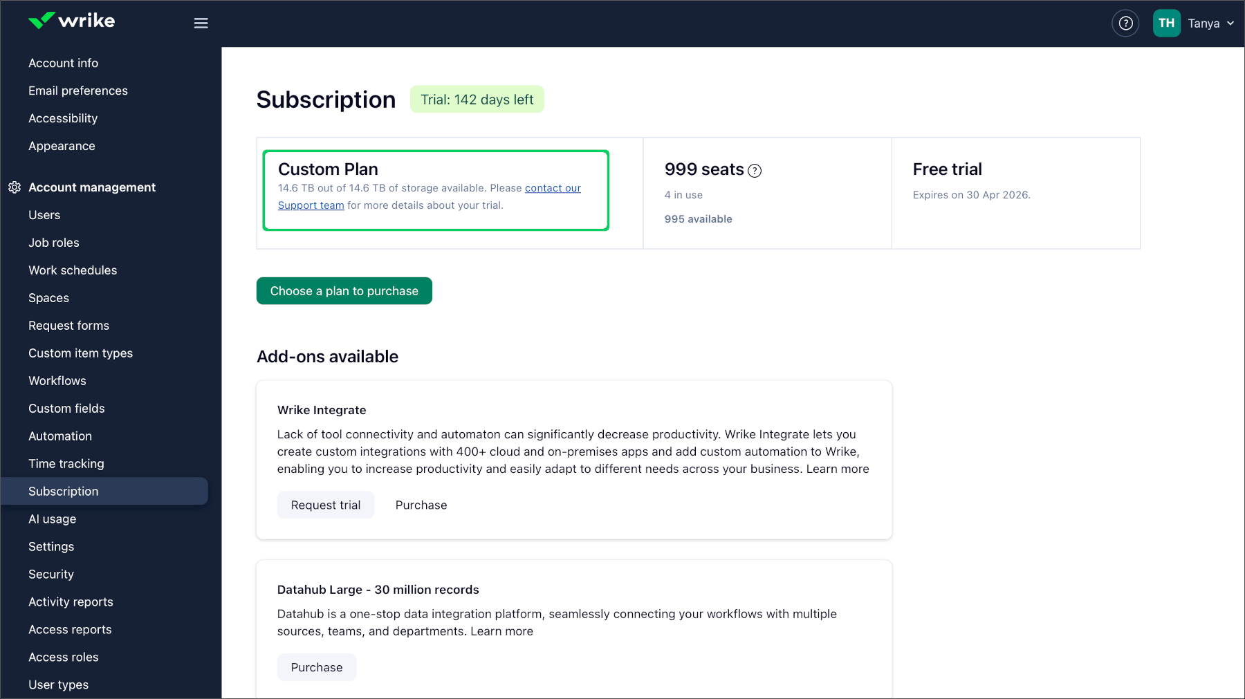 Если ваш тарифный план Wrike был понижен, доступное место уменьшается в соответствии с лимитами нового плана. Файлы, которые ранее были загружены в ваш аккаунт, останутся доступными. Однако, если использованный объём превышает новый лимит места, это может повлиять на возможность загружать новые файлы, пока вы не освободите место.